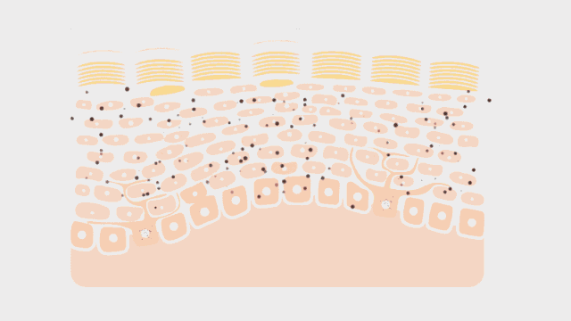 下面是一張人體的皮膚結構圖。在正常情況下,皮膚底部的基底層會不斷生成角蛋白細胞,然后不斷移動最終脫落。與此同時,同樣位于基底層的黑色素細胞會通過絡氨酸酶不斷制造黑色素,轉移進角蛋白細胞,搭起了“便車”。